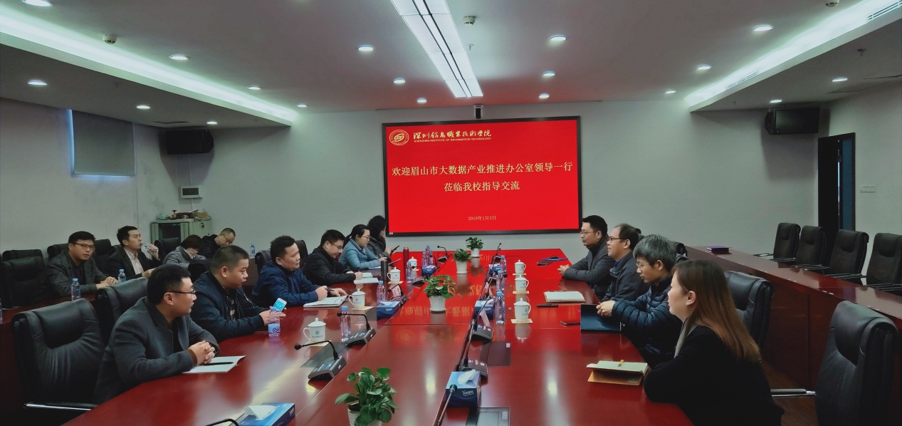 1月3日,眉山市大数据产业推进办公室专职副主任何健率队一行9人来我校考察深信华为ICT学院建设情况。电子与通信学院许志良院长、管明祥副院长、姜俊侠副院长接待了客人。